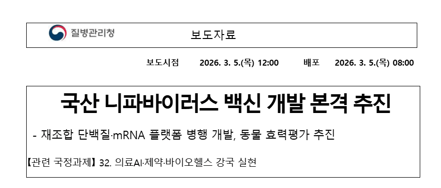 韓国疾病管理予防庁(KDCA)と国立衛生研究所(NIH)は、高リスクの人獣共通感染症であるニパウイルス感染症に積極的に対応するため、国内企業と協力して国産ニパウイルスワクチンの開発を積極的に推進している。